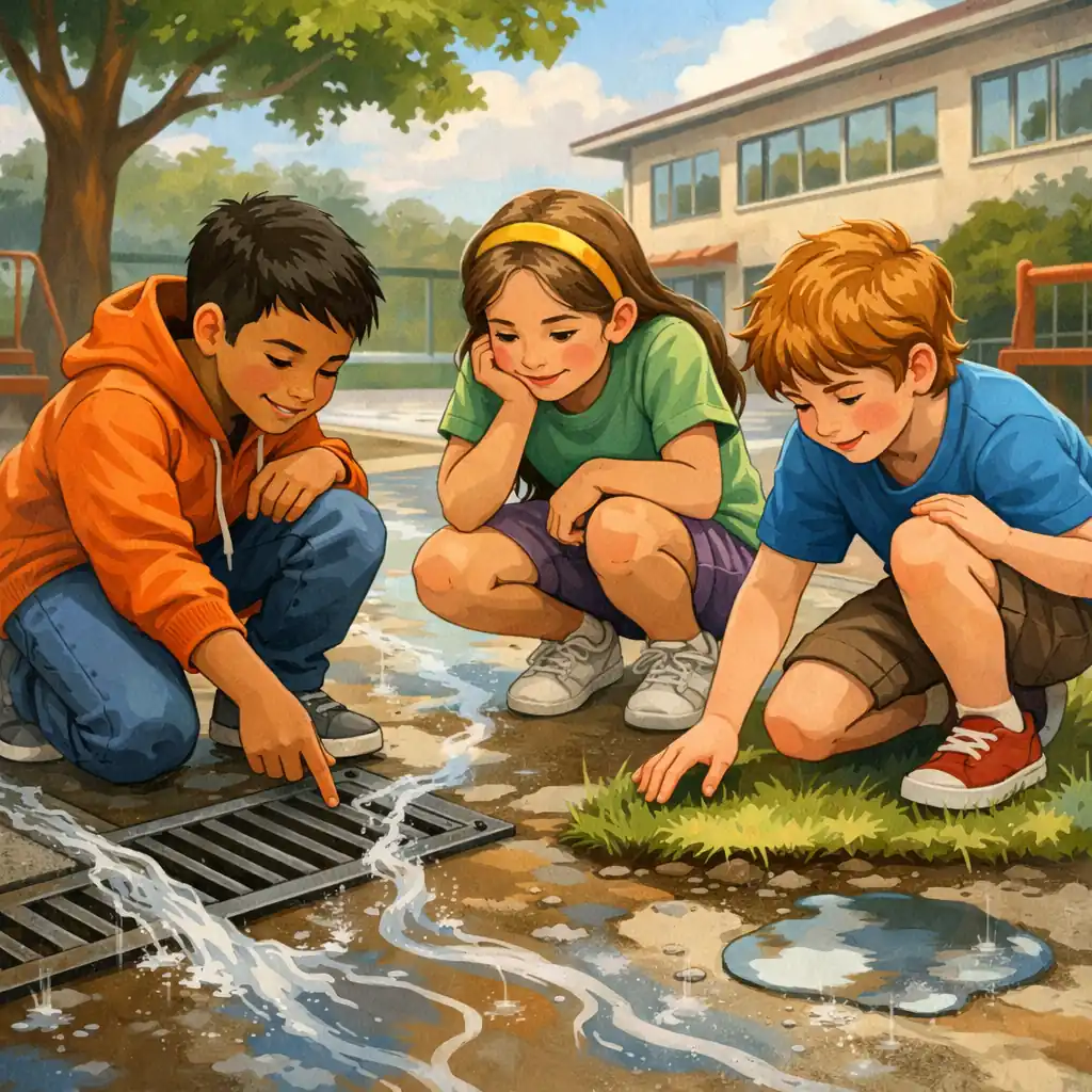 Caminhos da chuva no patio da escola: Você já reparou como a água da chuva escolhe caminhos diferentes no pátio da escola dependendo do que ela encontra pela frente? Depois de uma chuva, o pátio não fica molhado do mesmo jeito em todo lugar. Na área de concreto, a água fica parada em poças que demoram a sumir. No canteiro de terra ao lado, ela some quase sem deixar rastro na superfície. Mesma chuva, mesmo momento — e dois destinos completamente diferentes.