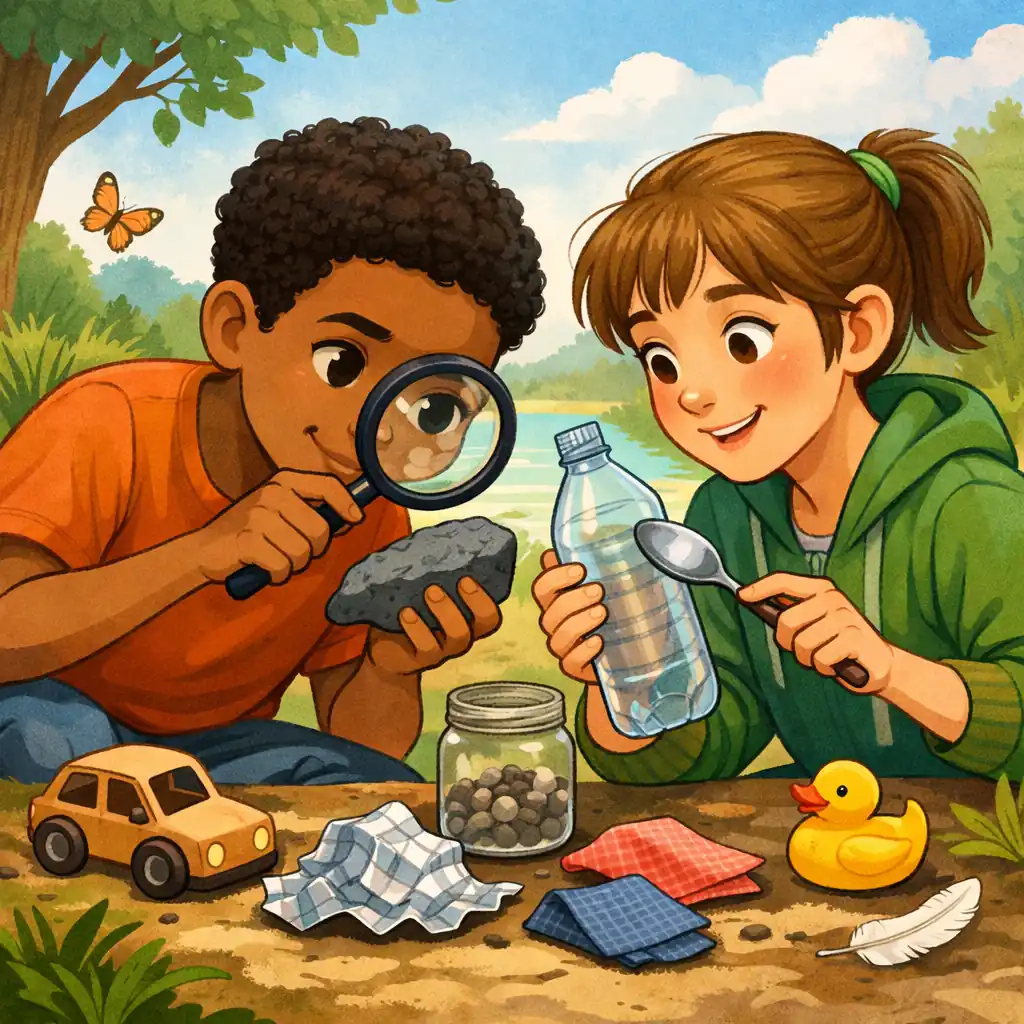 Pega duas garrafas: uma de vidro, outra de plástico. As duas guardam o mesmo líquido. Por outro lado, a de vidro veio da areia, enquanto a de plástico veio do petróleo — um líquido escuro que se formou ao longo de milhões de anos a partir de restos de seres vivos antigos, lá no fundo da terra. Se você segurar as duas ao mesmo tempo, já vai sentir a diferença: o peso, a temperatura, a textura. Materiais diferentes, experiências diferentes, histórias completamente diferentes. Nesse sentido, entender o que a pergunta “do que as coisas são feitas” ajuda a revelar é também perceber que objetos parecidos podem ter origens muito distantes entre si.